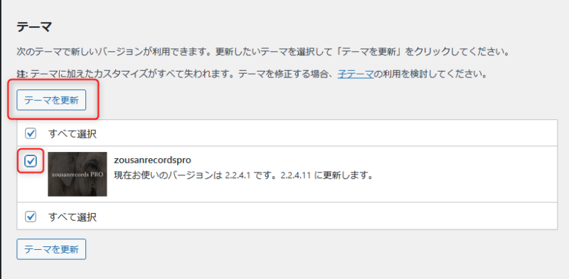 にてご確認いただけます。新しいバージョンがある場合はチェックを入れて「テーマを更新」でアップデートいただけます。