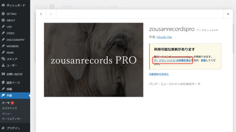 外観→テーマ→テーマの詳細→バージョン◯.◯.◯の詳細を表示