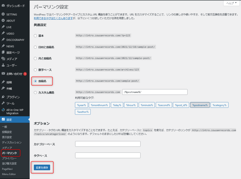 にて「投稿名」にチェックが入っているのを確認して、(何も変更していなくても)「変更を保存」をクリックしてください。(※「投稿名」以外に設定すると不具合が発生する可能性があります)