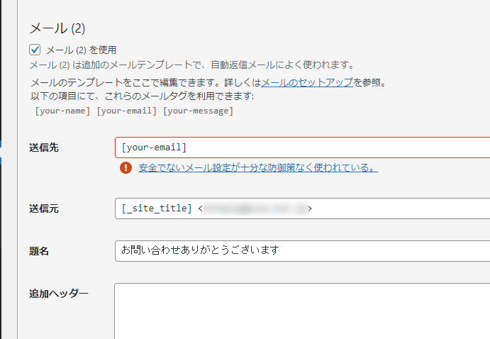 自動返信用のメール(2)の送信先には[your-email]が設定してありますがデフォルトではエラーメッセージが表示されます。
