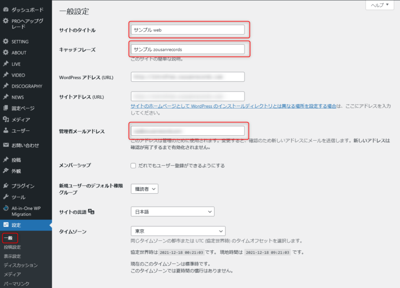 サイト名など基本設定部分もサンプルサイトのものになっていますので書き換えます。
