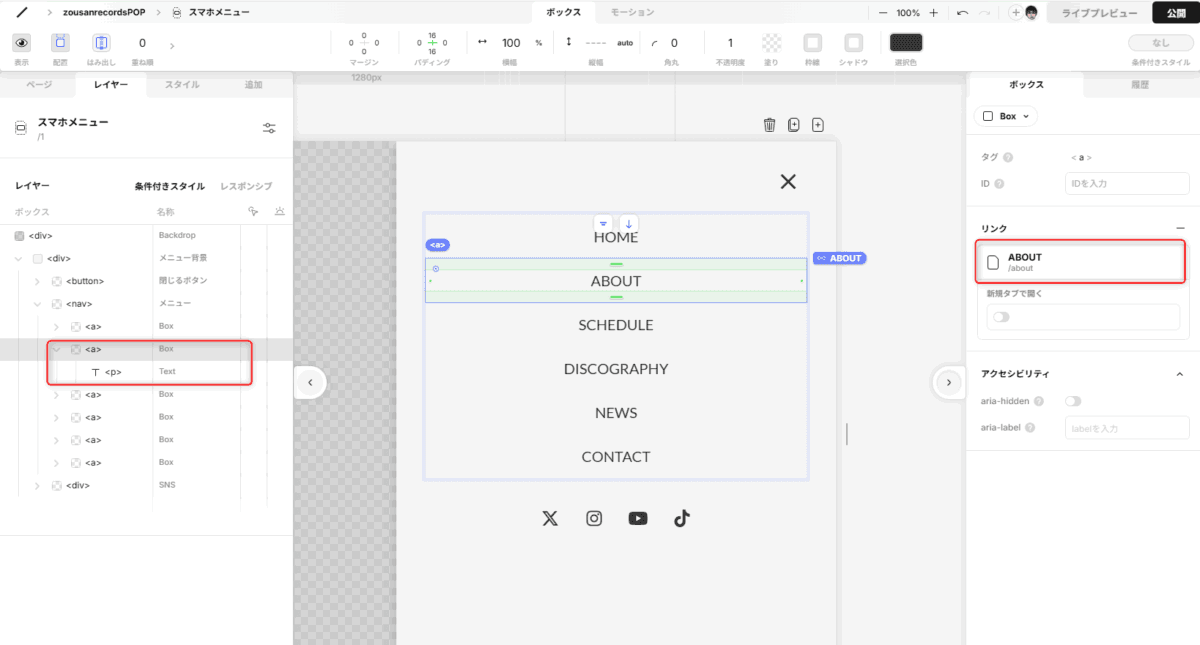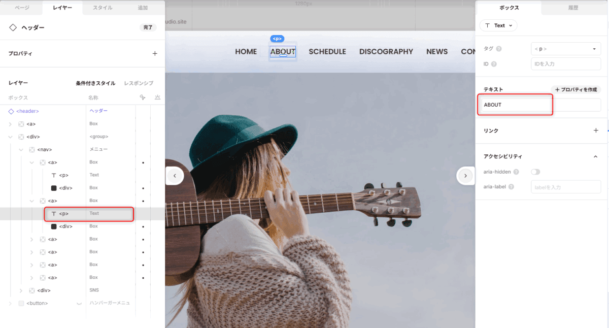 メニュー名は<a>の中の<p>を選択した状態で右側メニューの「テキスト」にて変更いただけます。