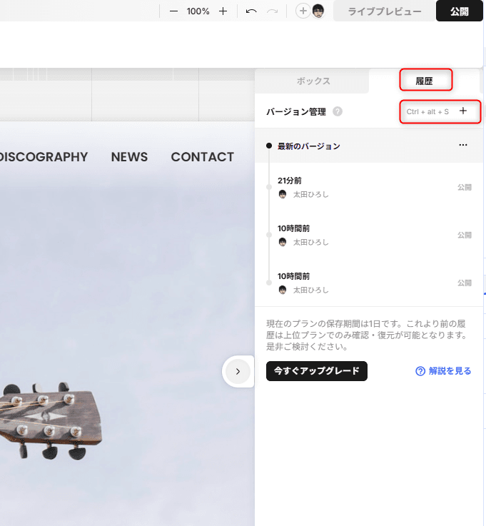 バックアップは右側のメニューを開いて「履歴」タブにて「+」マークをクリックです。