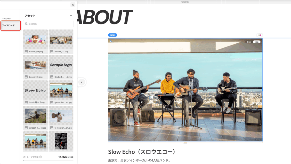 メニューの「アップロード」からご自身のロゴをアップロードします。