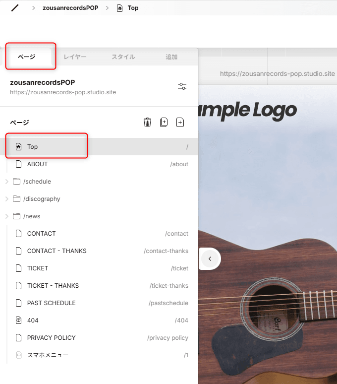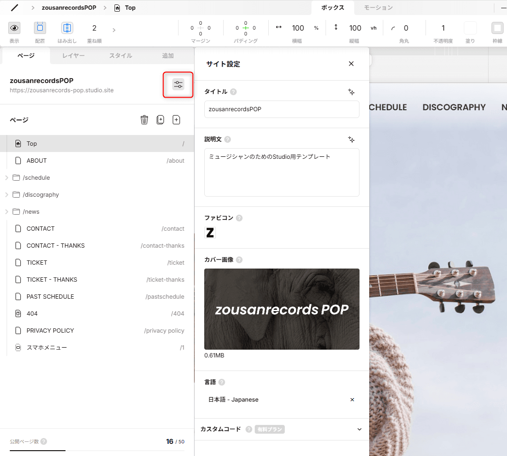 「ページ」タブの設定マークでサイト設定のメニューが開きます。