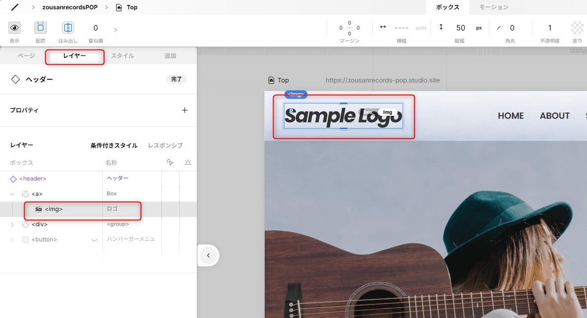 レイヤータブにて<header>をダブルクリック→ロゴの画像をダブルクリック