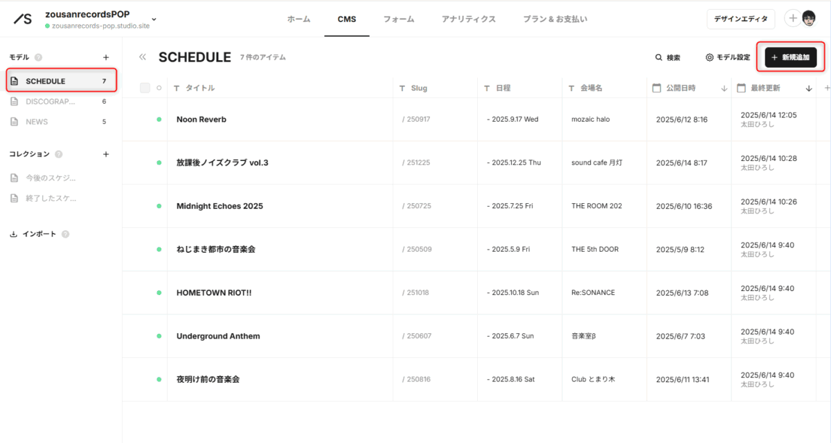 「CMS」から「DISCOGRAPHY」を選択→「新規追加」