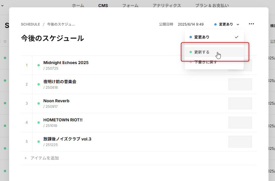 左メニューにて「SCHEDULE」を選択→「新規追加」