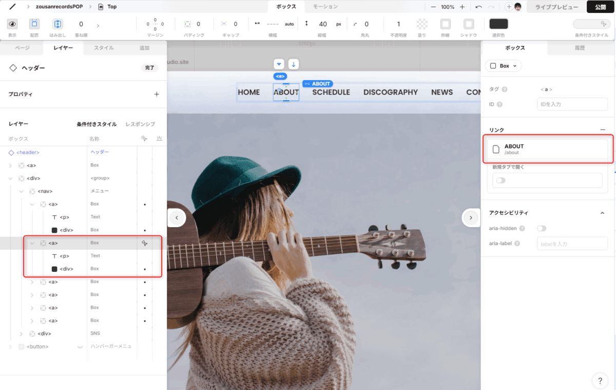 リンクの変更は<a>を選択した状態で右側メニューの「リンク」にて変更いただけます。