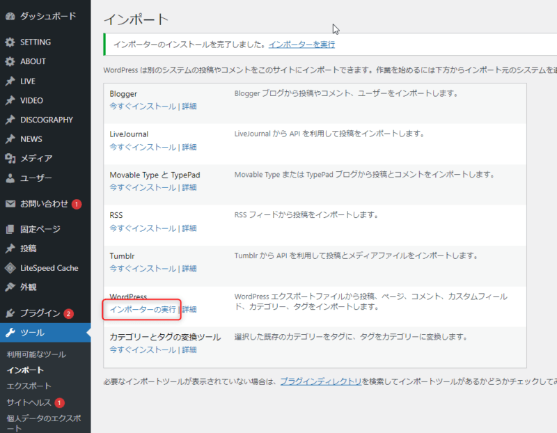 ツール→インポート→WordPress→今すぐインストール→インポーターの実行