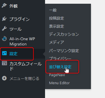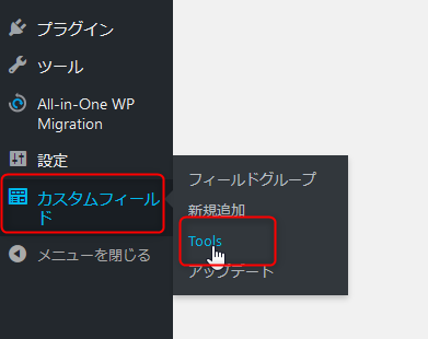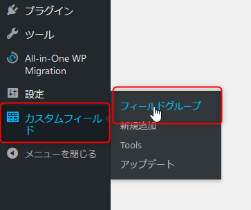 次にプラグイン「advanced custom fields」を更新します。管理画面メニュー