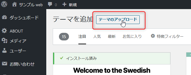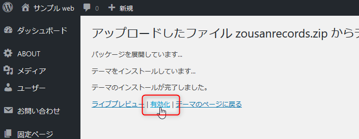参照から、テーマのzipファイルを選択。(zipファイルは解凍せずにそのまま)を選択