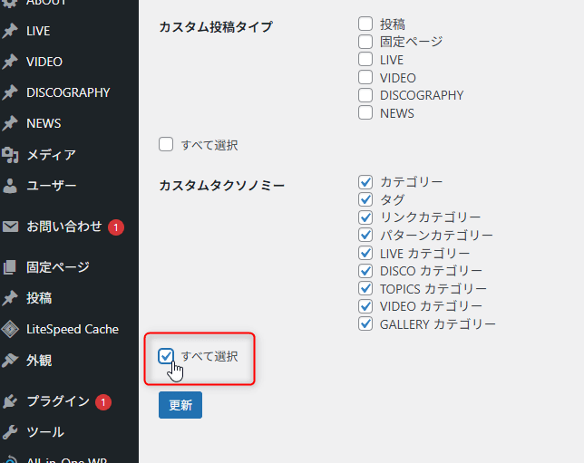 カスタムタクソノミーの「すべて選択」にチェックを入れて更新。