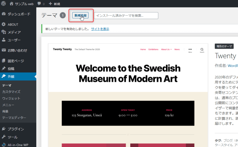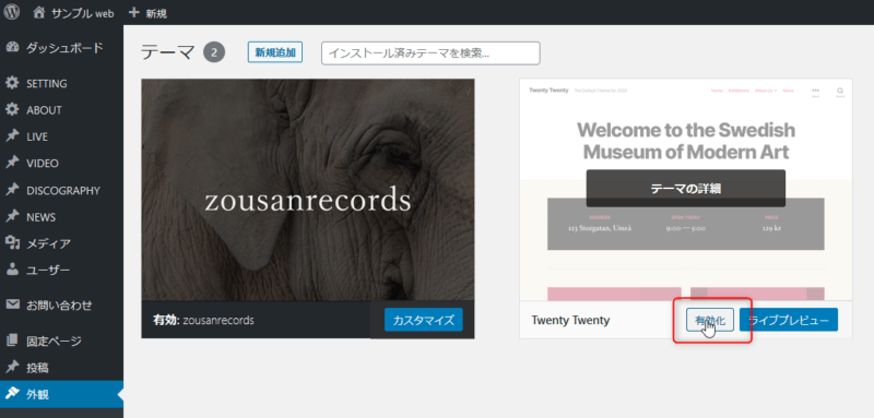 テーマを削除するため、便宜上、一旦別のテーマを有効化します(有効化するテーマは別のものであれば何でも構いません)。