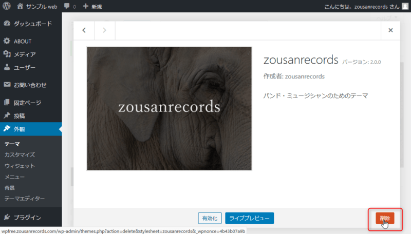 流れとしては、現在有効化しているテーマを一旦削除→最新のテーマをインストール、有効化