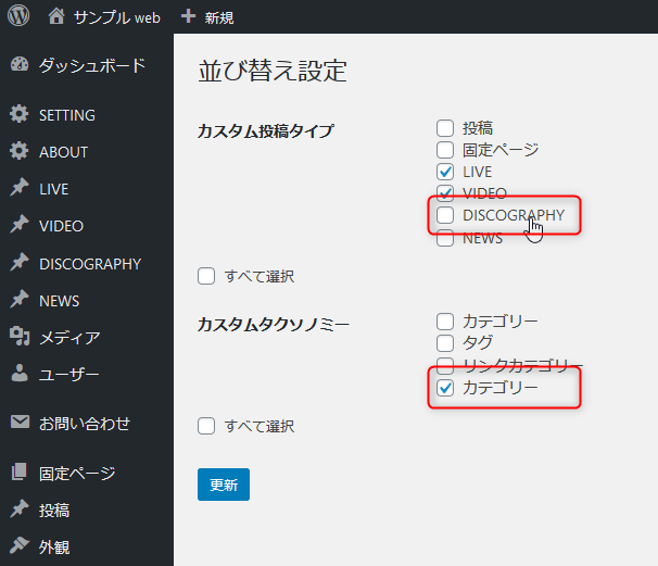 カスタム投稿タイプの「DISCOGRAPYY」のチェックを外して、カスタムタクソノミーの一番下のカテゴリーにチェックを入れます。