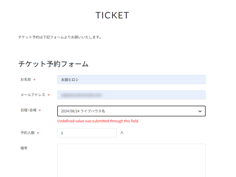 「Undefined value was submitted through this field.」というエラーメッセージが表示されます。