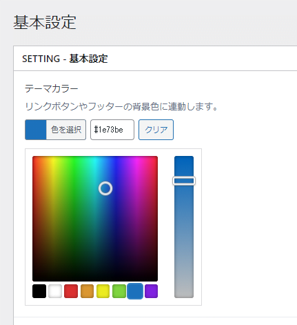 設定したカラーはメニューやリンクボタン、フッターの背景色に連動します。