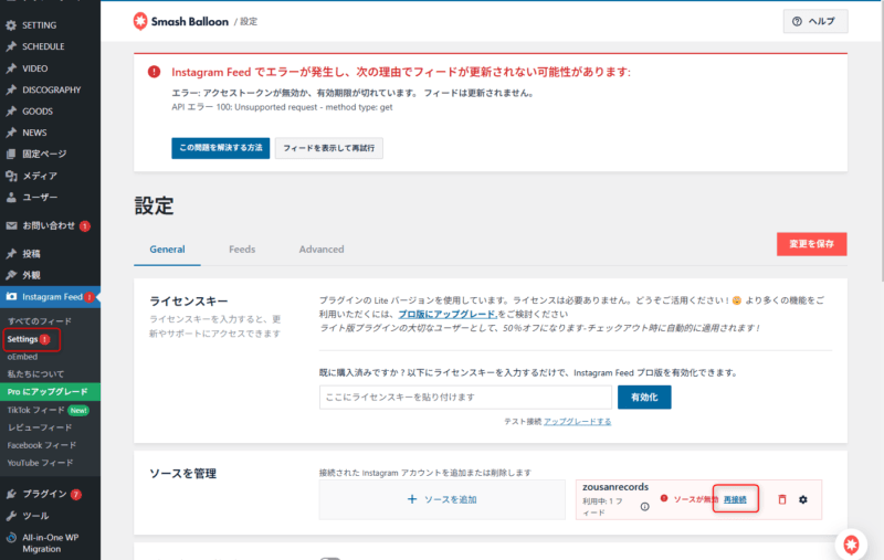 Instagram Feed→Setting→Generalタブ→ソースを管理