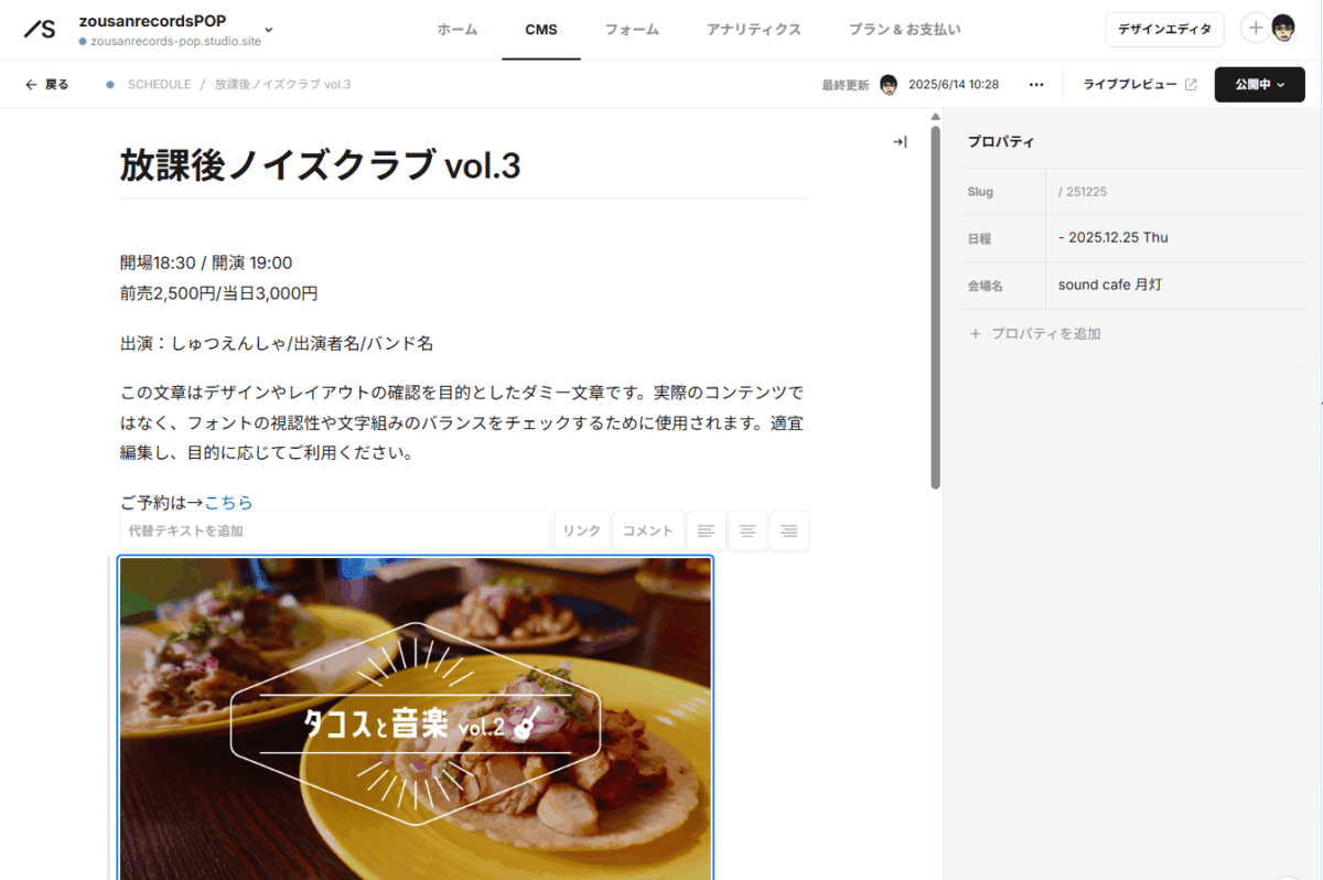 WordPress版では終了したライブ情報は「今日」を過ぎると自動的に今後の予定からは削除、過去のライブ情報はアーカイブで閲覧可能、という機能がありますが、Studio版ではそれが実装できず、表示を手動で切り替える必要があります。