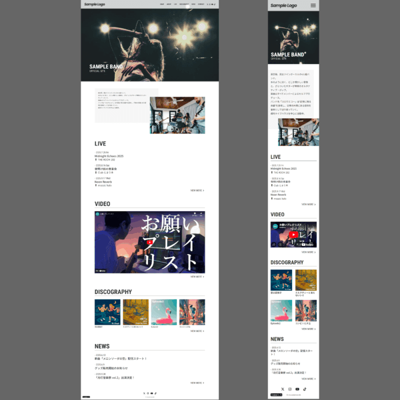 そこで、ミュージシャンのホームページ用に最適な形にカスタマイズ済みのテンプレートを制作しました。