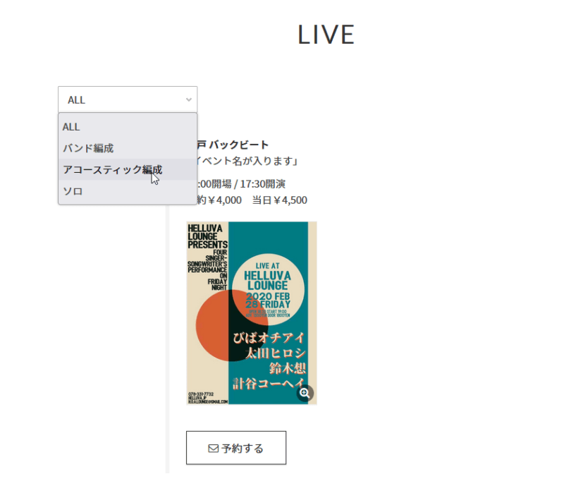日程・会場は手入力しなくても、今日以降のライブ予定が選択肢の中に自動的に入ります。